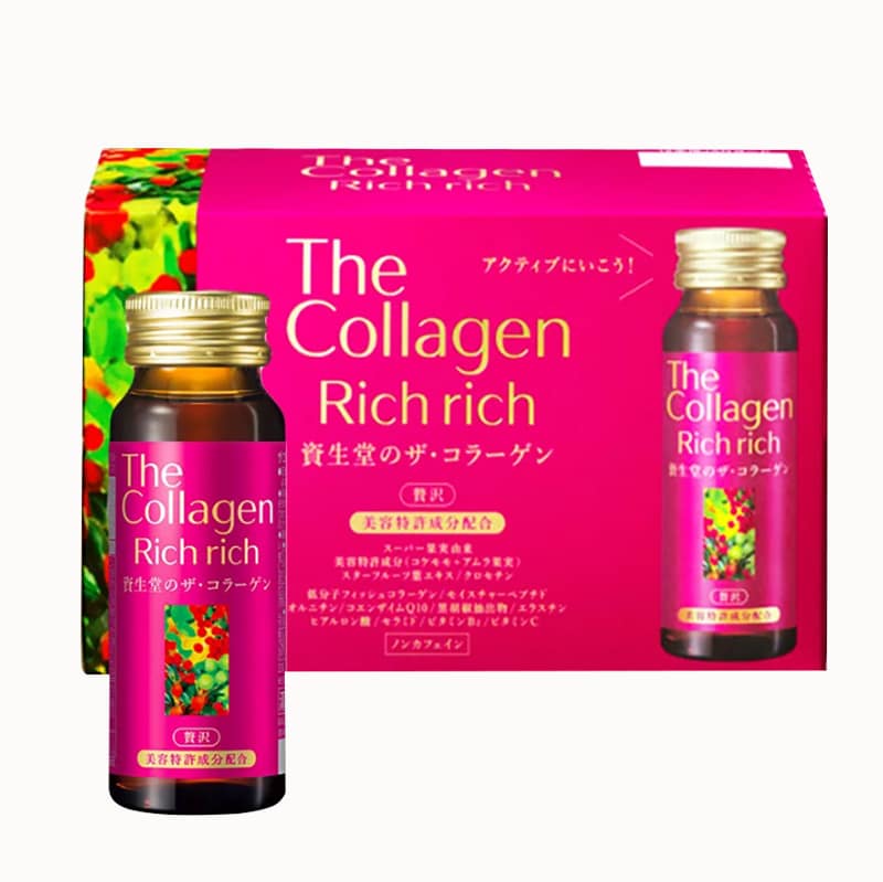 - The Collagen Shiseido Rich là dạng nước dành cho độ tuổi trên 35 trở đi. Sản phẩm này giúp tăng cường Coenzyme Q.10 và dưỡng ẩm tối đa cho làn da. Đồng thời, hỗ trợ tim mạch, hệ miễn dịch cho cơ thể