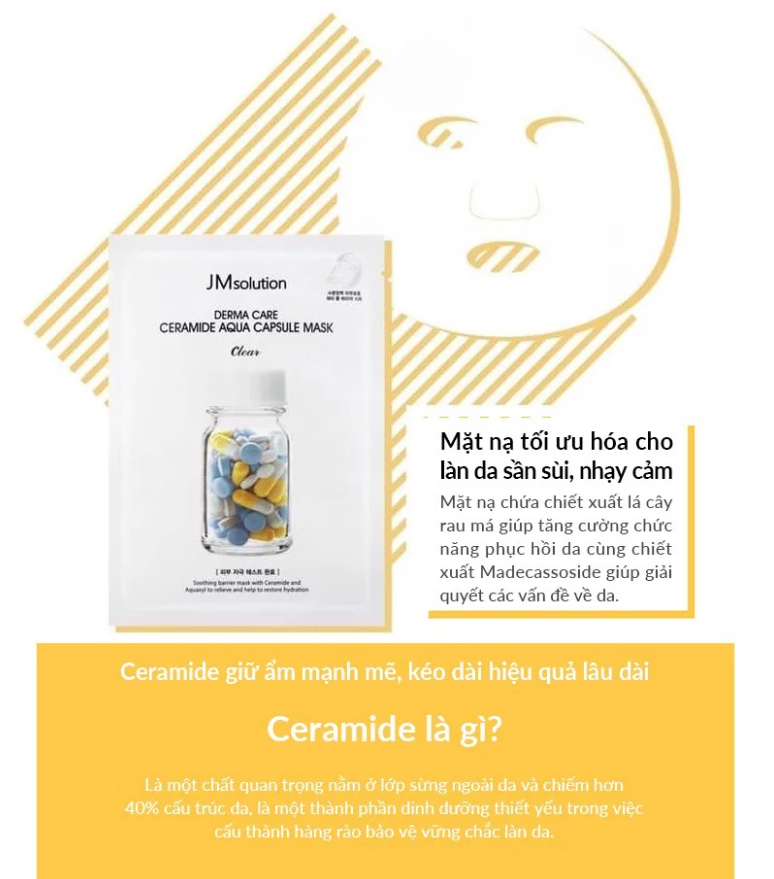 - 4 MẶT NẠ CERAMIDE: Dành cho mọi loại da. Chiết xuất Centella, Madecassoside giúp làm dịu, giảm kích ứng và bảo vệ da khỏi những tác nhân bên ngoài, bổ sung độ ẩm giúp da luôn mềm mịn