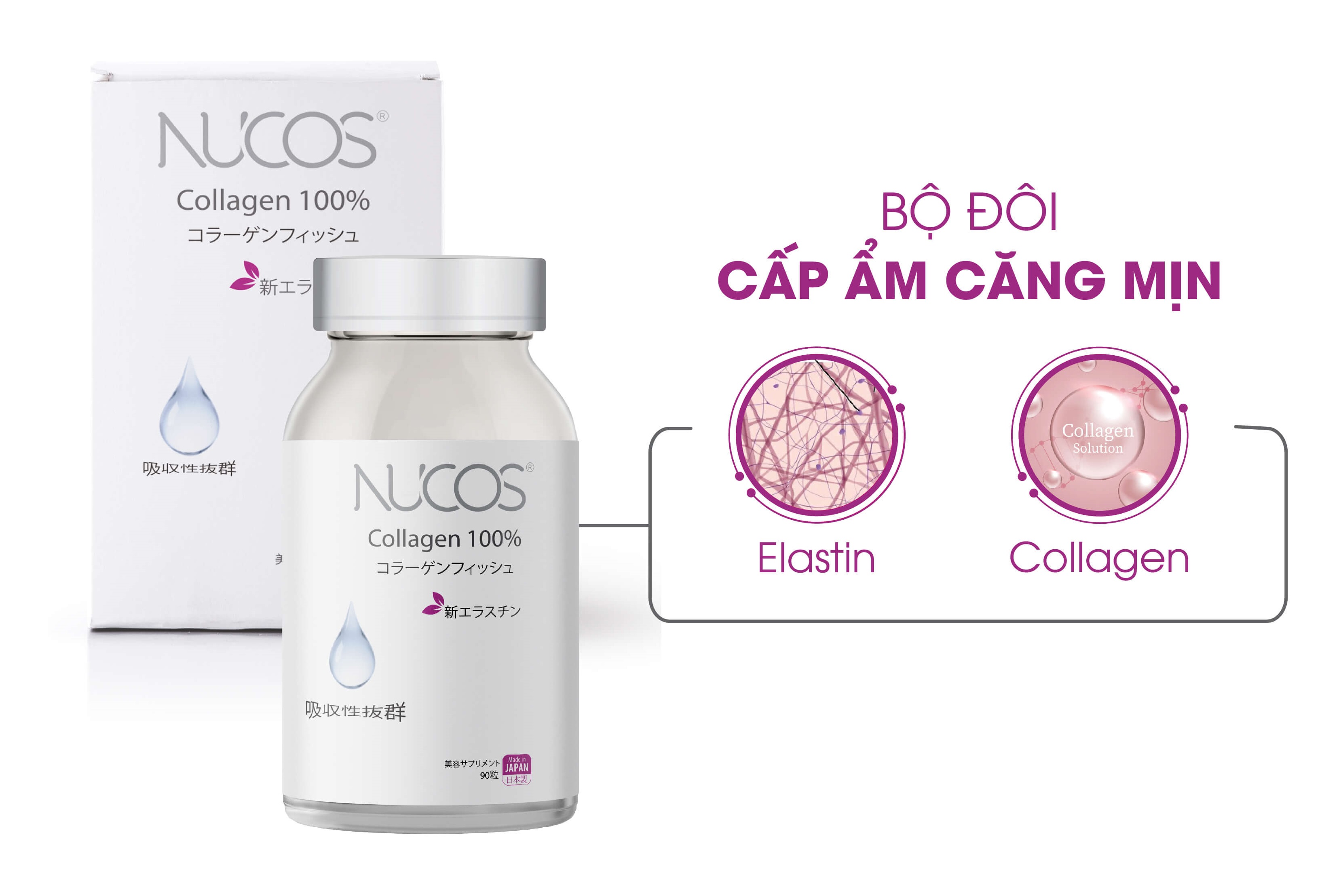 Nucos Collagen 100% - Viên uống bổ sung collagen giúp tăng độ ẩm mịn cho làn da duy trì sự trẻ trung đồng thời tăng độ đàn hồi cho làn da căng mướt.
