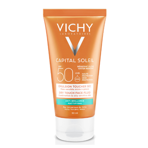 Kem Chống Nắng Cho Da Dầu, Không Nhờn Rít Vichy Ideal Soleil Mattifying Face Fluid Dry Touch SPF50+ là kem chống nắng không màu Vichy Ideal Soleil là chống nắng hoàn toàn không bóng nhờn với 4 màng lọc giúp bảo vệ da hoàn hảo trước tác hại của các tia cực tím độc hại UVA/UVB và chứa 2 thành phần giúp mang lại cảm giác khô ráo và không bóng dầu thuộc thương hiệu dược mỹ phẩm Vichy đến từ Pháp