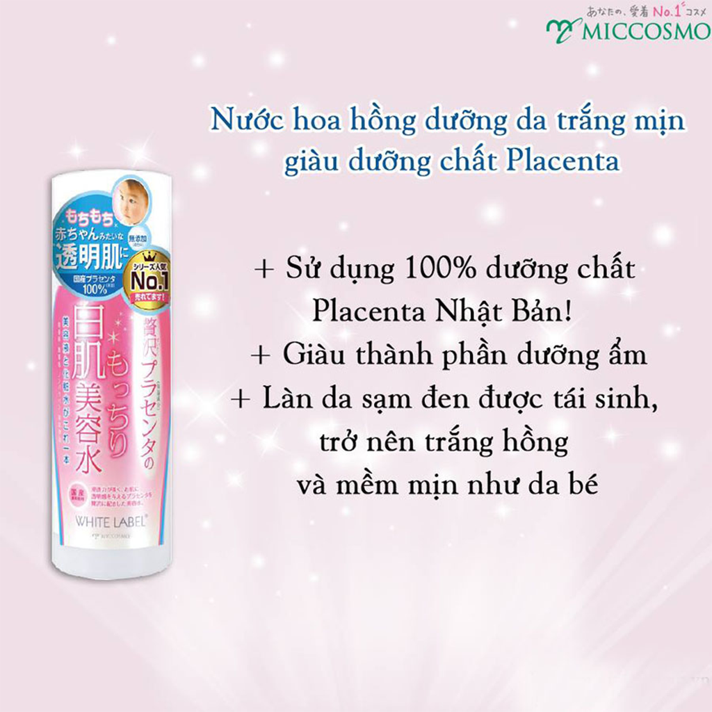 Nước hoa hồng placenta trắng da tinh chất nhau thai White Label được sản xuất trên dây chuyền công nghệ khép kín hiện đại chất lượng Nhật Bản và là sản phẩm ra đời từ một công thức độc quyền với 100% dưỡng chất Placenta (tinh chất nhau thai) được tuyển chọn theo chuẩn chất lượng Nhật Bản. Nước hoa hồng White Label giúp loại bỏ các đốm đen, tàn nhang, đen sạm, làm đầy nếp nhăn, cung cấp độ ẩm cho da... giúp bạn nhanh chóng sở hữu làn da trắng hồng và mềm mịn như da em bé