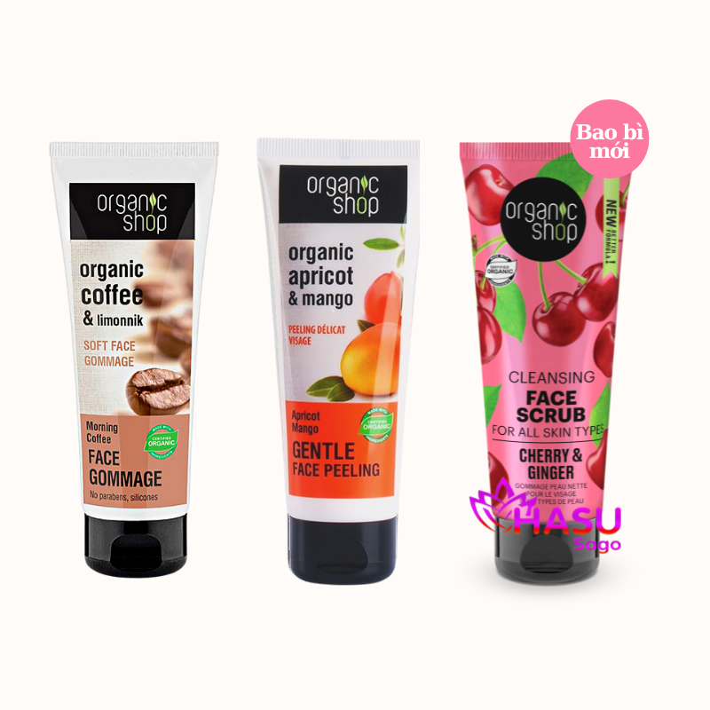 Tẩy Da Chết Cho Da Mặt Organic Shop Chiết Xuất Từ Cà Phê, Xoài & Mơ, Gừng & Hoa Anh Đào Bản Anh 75ml
