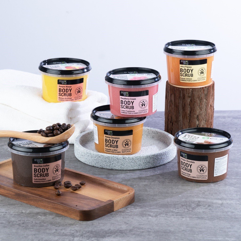- Kem tẩy da chết toàn thân Organic Shop organic coffee & sugar body scrub chứa chiết xuất hạt cà phê giàu chất chống oxy hóa và thành phần vitamin có tác dụng loại bỏ tế bào chết, làm sạch lỗ chân lông và cung cấp các dưỡng chất cần thiết cho làn da toàn thân trở nên mịn màng và sáng mịn hơn sau mỗi lần sử dụng