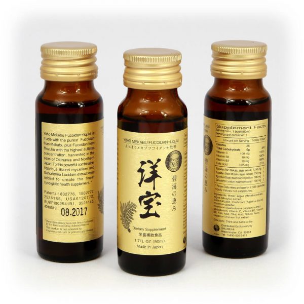 Yoho Mekabu Fucoidan dạng nước của Nhật là sản phẩm sản xuất tại Nhật Bản, do SHUREIHI (Westminster, CA 92683) phân phối độc quyền tại Hoa Kỳ. Thuốc Fucoidan được cấp bằng sáng chế tại Hoa Kỳ và Châu Âu